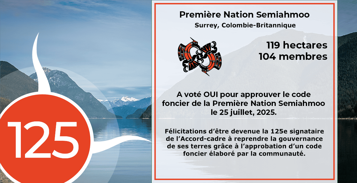 La Première Nation Semiahmoo vote OUI et devient la 125e signataire de l’Accord-cadre à ratifier son code foncier! 2026-04-17T08:31:20-07:00avril 17th, 2026| Related Posts La Nation Crie du Montreal Lake vote OUI et devient la 128e signataire de l’Accord-cadre à ratifier son code foncier! La Première Nation Popkum vote OUI et devient la 127e signataire de l’Accord-cadre à ratifier son code foncier! La Première Nation Tseycum vote OUI et devient la 126e signataire de l’Accord-cadre à ratifier son code foncier!